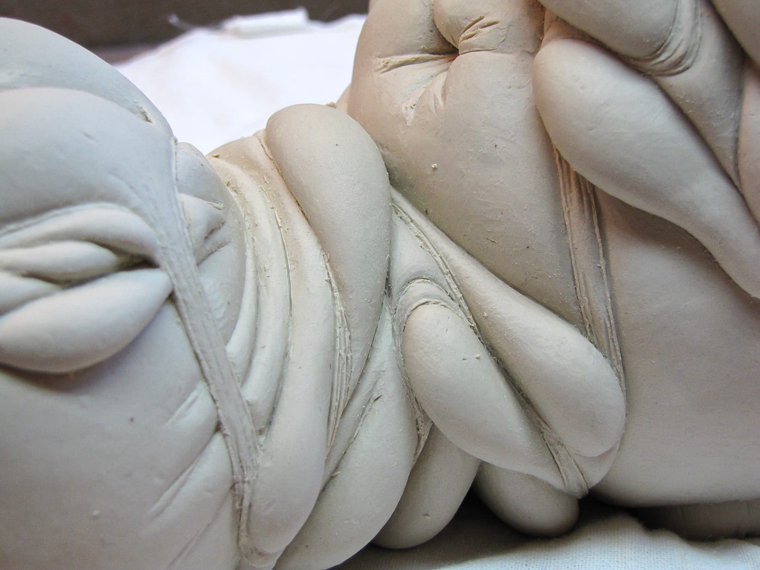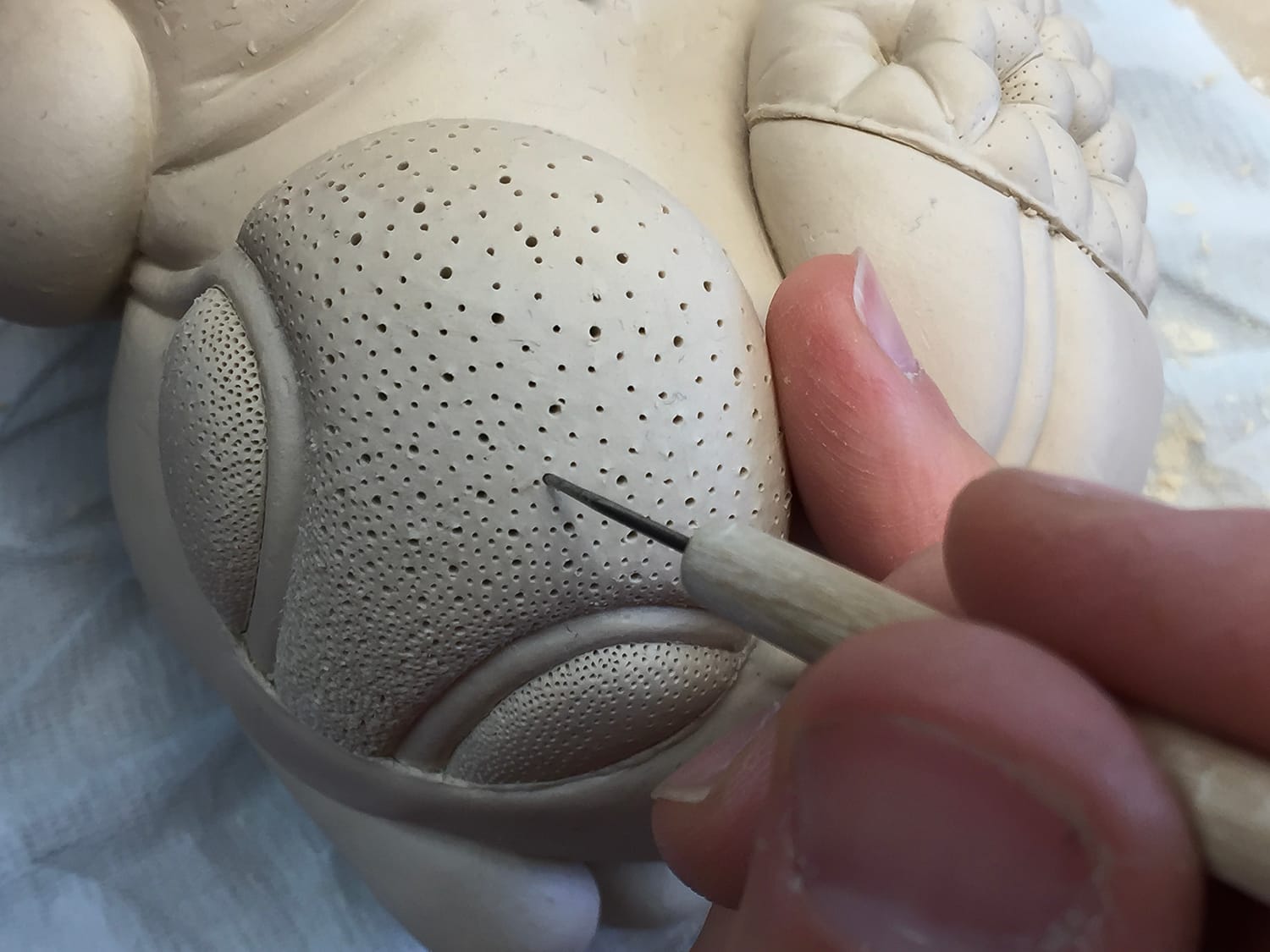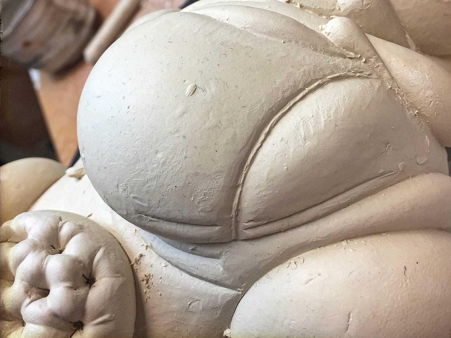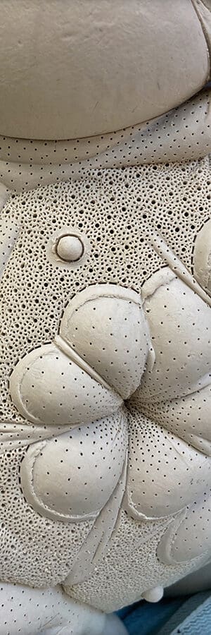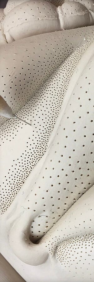 as the piece gets mapped out (i.e., which layers go where) I begin to incorporate textures, motifs. within a week or so, I know what the finished piece will look like. my sketchbook remains empty. the next several weeks are spent carving and refining this surface, eventually using a small brush (#2 filbert) as a smoothing tool. the clay remains leatherhard. it is spritzed constantly.