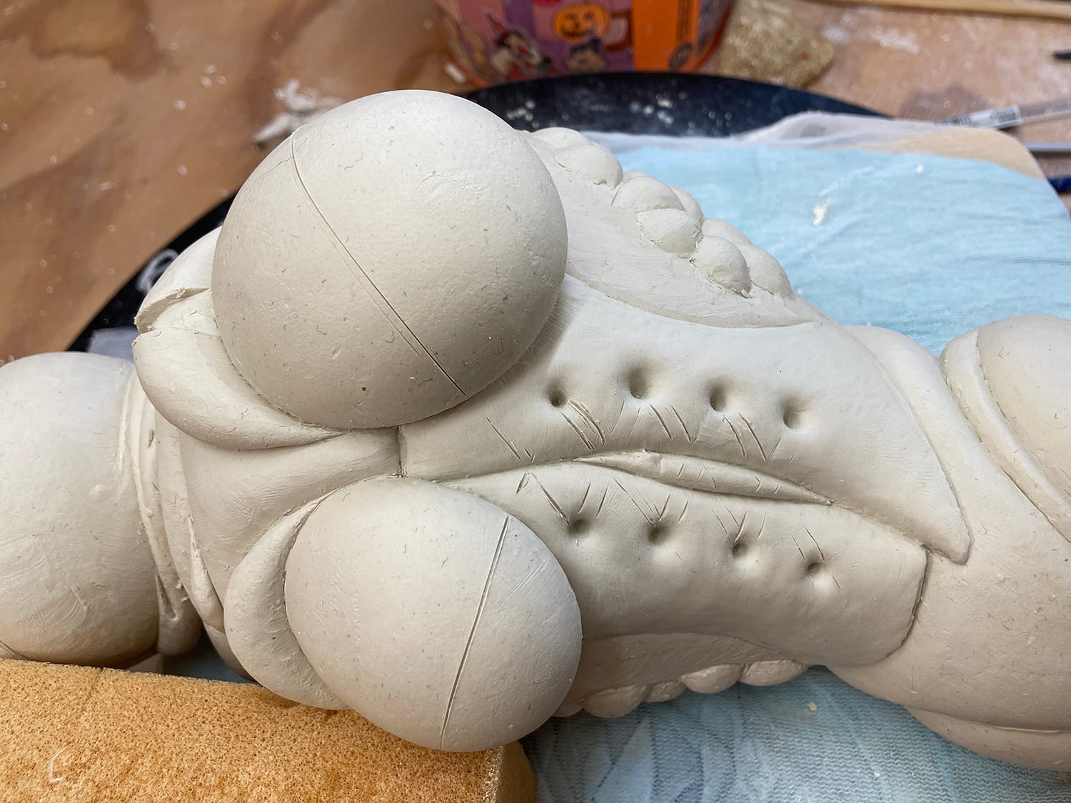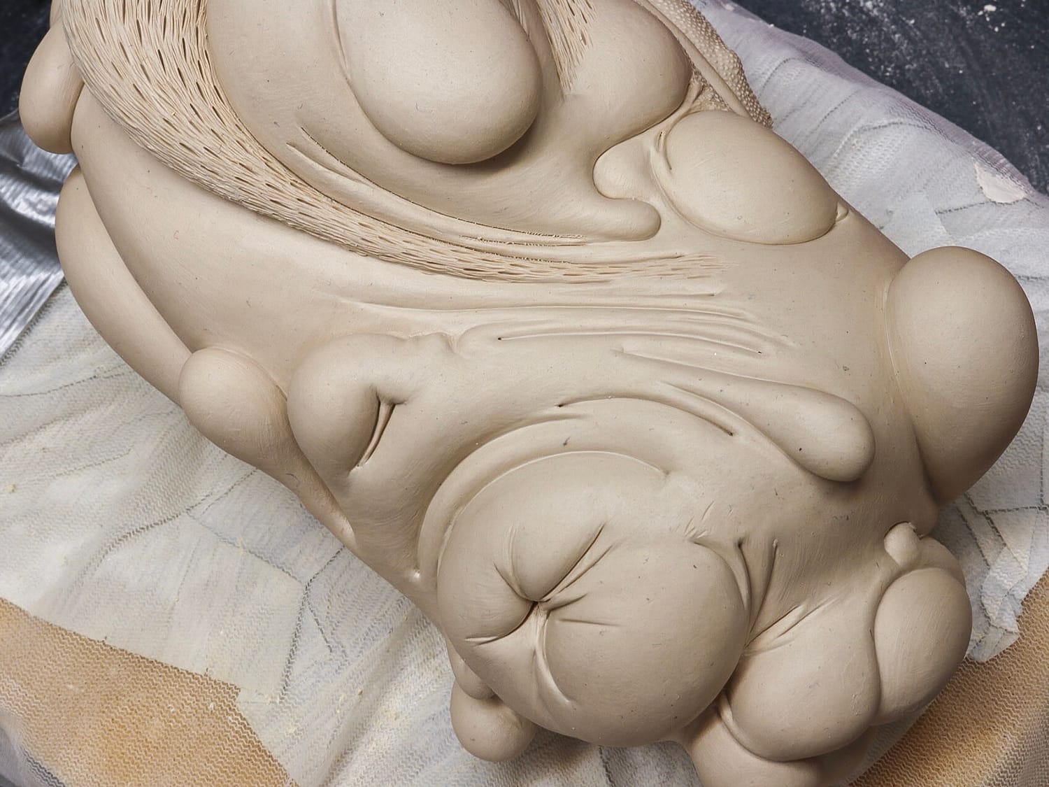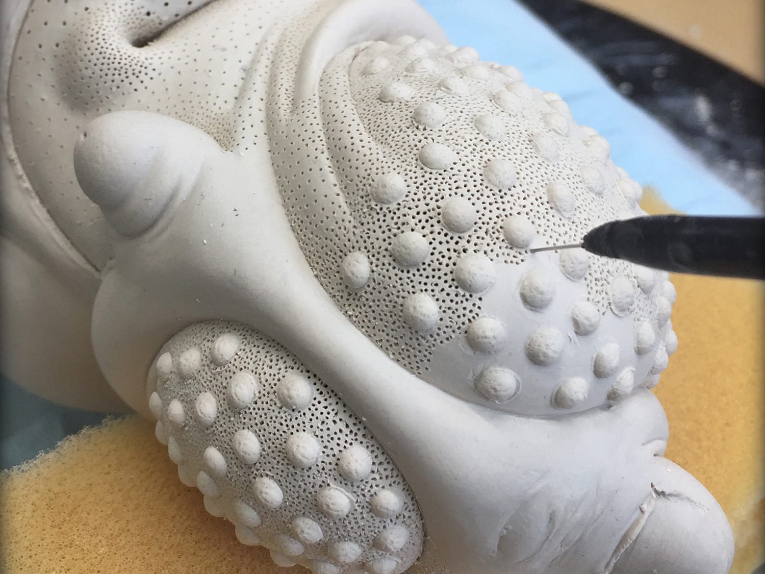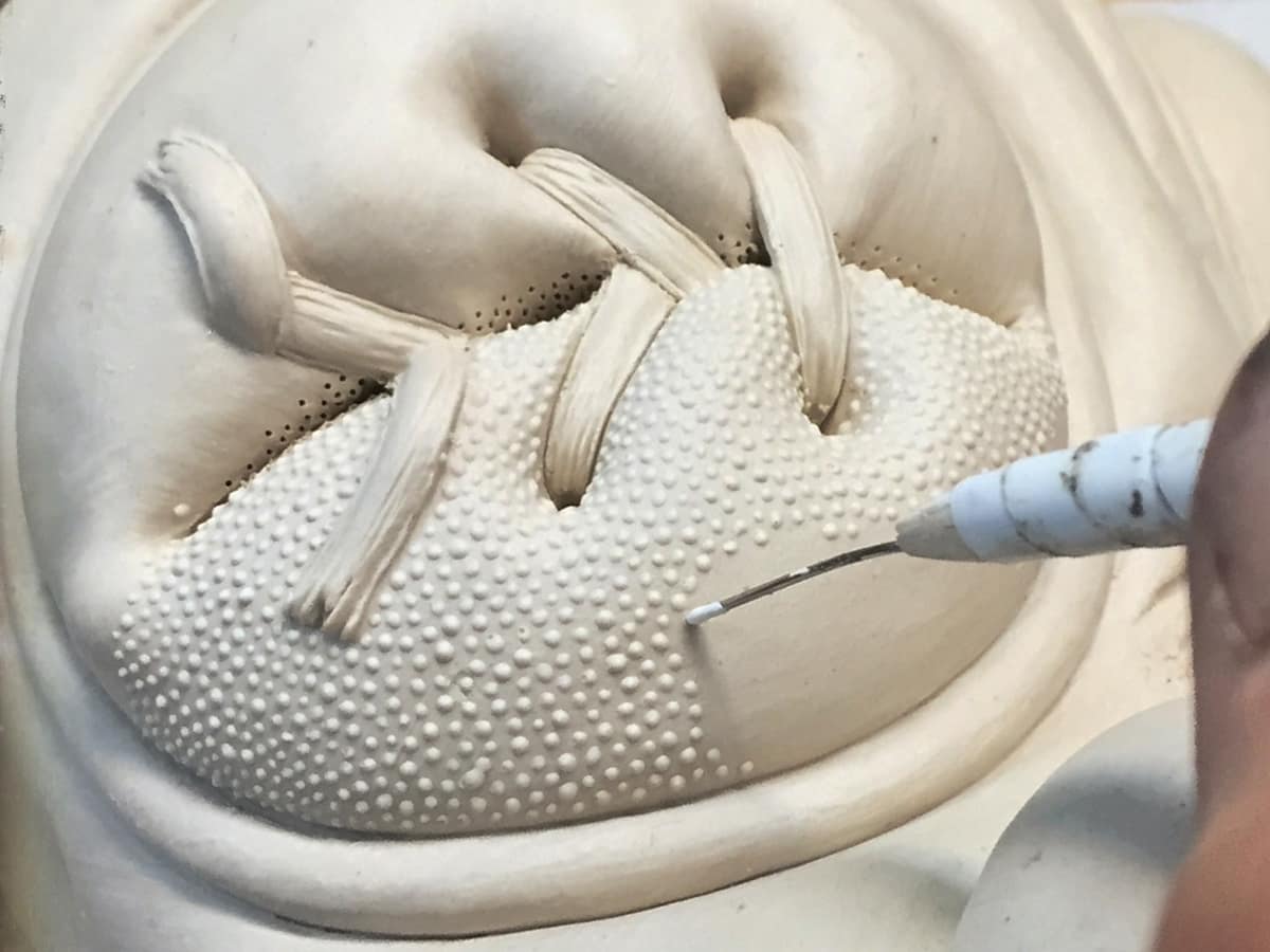 as the piece gets mapped out (i.e., which layers go where) I begin to incorporate textures, motifs. within a week or so, I know what the finished piece will look like. my sketchbook remains empty. the next several weeks are spent carving and refining this surface, eventually using a small brush (#2 filbert) as a smoothing tool. the clay remains leatherhard. it is spritzed constantly.