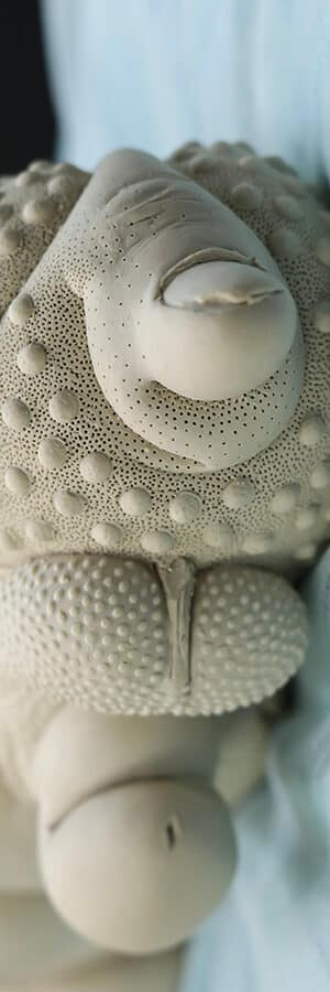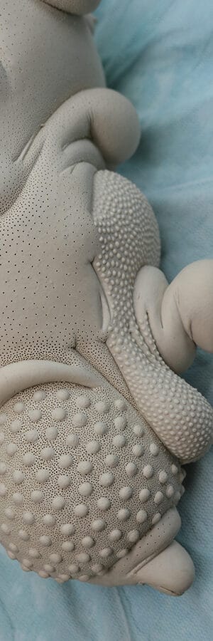 depending on the piece, it will be re-fired 2-5 times at lower temperatures with stains or lustres, trying to achieve a surface that compliments the form. I try to be subtle, unless subtle isn’t working.
