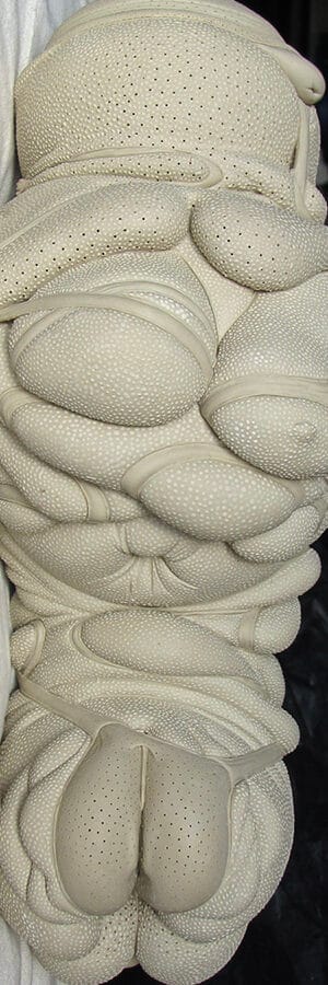 to start, I have a loose idea of a form. slender, squat, full, deflated, compact, pregnant, concealed, elongated…. I throw 5 or 6 parts, play around, and eventually assemble 2 or 3 of them. as I push this form around more words will come to mind. wrapped, squeezed, pinched, soft, snug, loose, erotic, quiet, busy, familiar, bizarre, unexpected. what influences these words — mood, state of mind, a glimpse? — isn’t important to me. they happen.